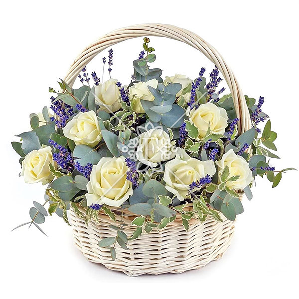 роза белая (кремовая) – 21 шт., лимониум фиолетовый, эвкалипт, питтоспорум, оазис, корзина